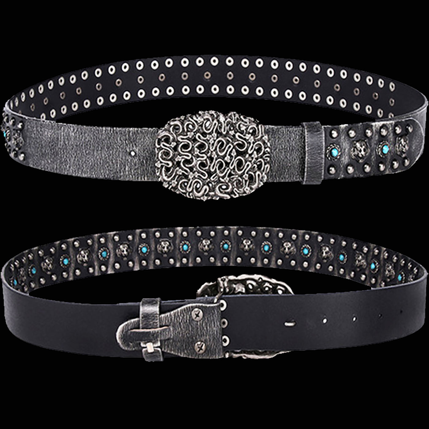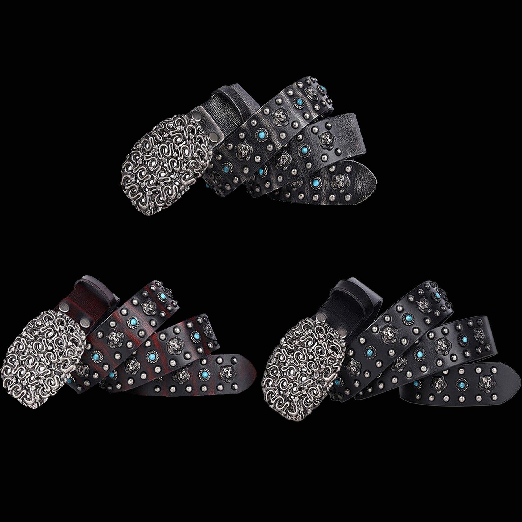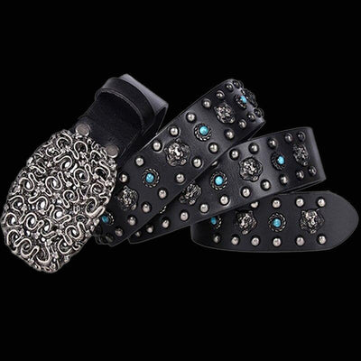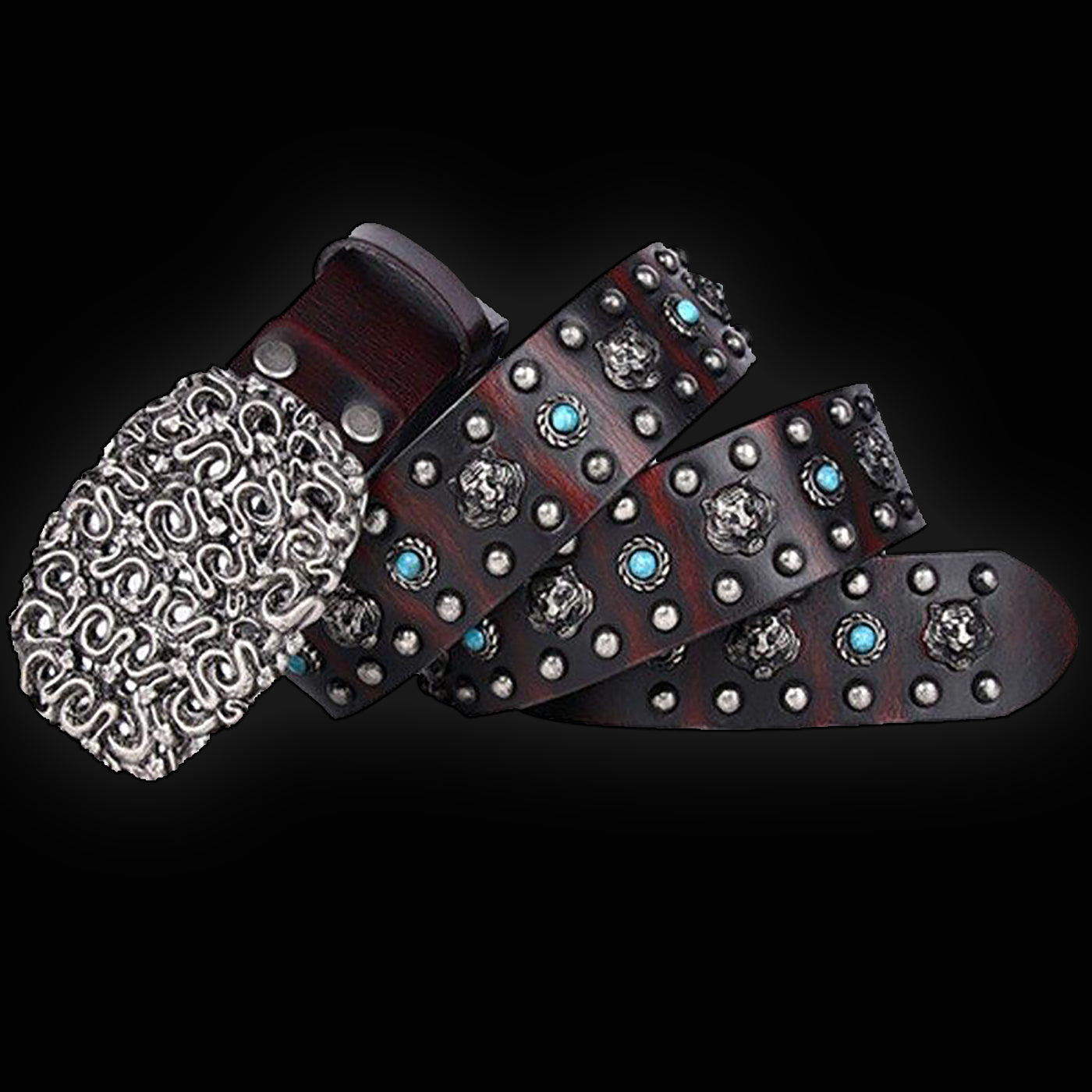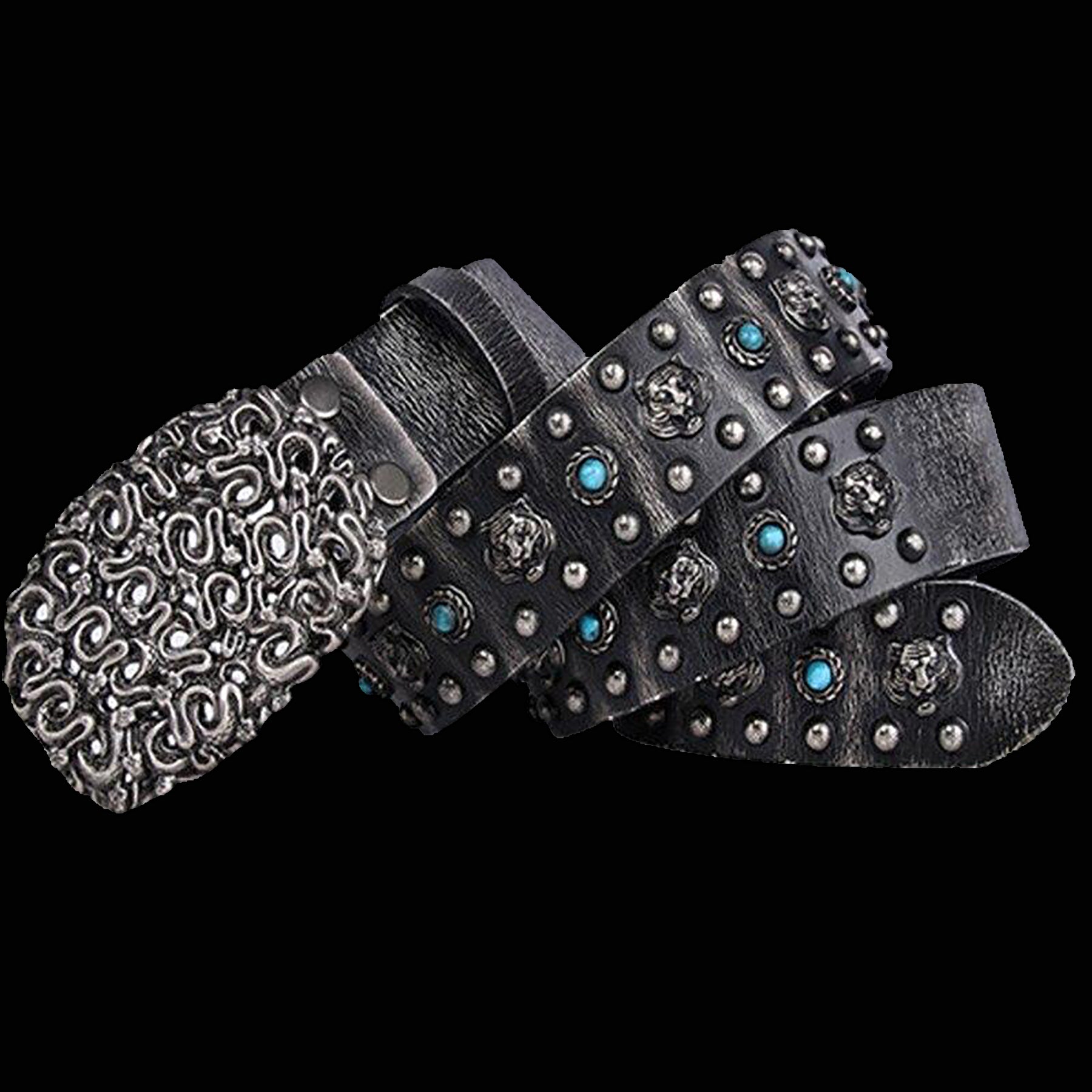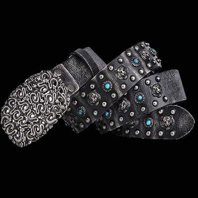 It's made of rugged, distressed, genuine cowhide studded with ornate lion heads, faux turquoise stones and studs. Did we say that the alloy belt buckle sports a pit of snakes?