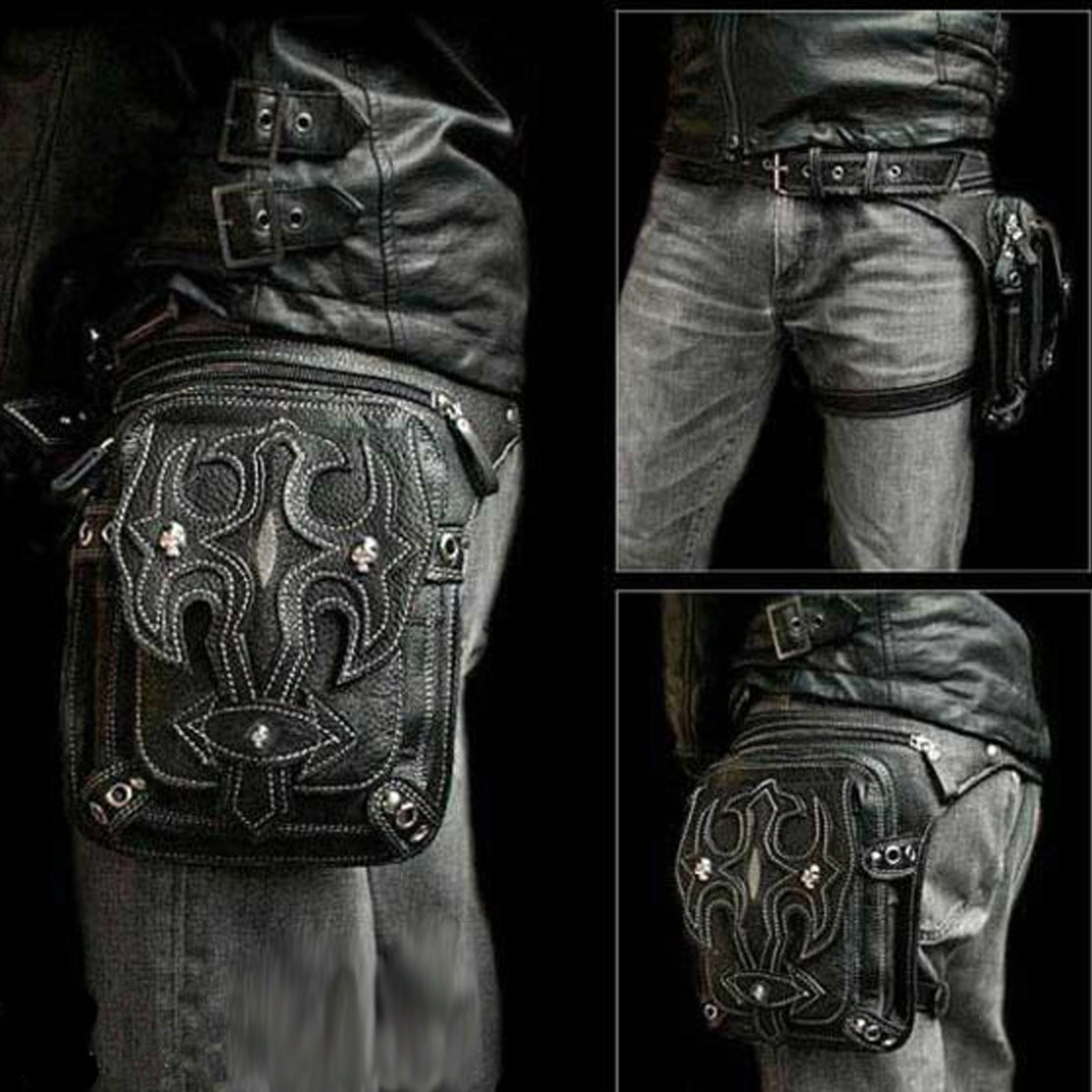 This dope carryshitwith comes in a western-style cross design with stitching. Skull buttons, pockets and zippers galore, and buckles to expand or contract the main compartment. It attaches snugly with a belt and thigh-strap. It's one of our favs—it's got that gunslinger look and can fit allot of your shit, so you can ride free without a backpack. The Gunslinger is 100% Badass Approved™.